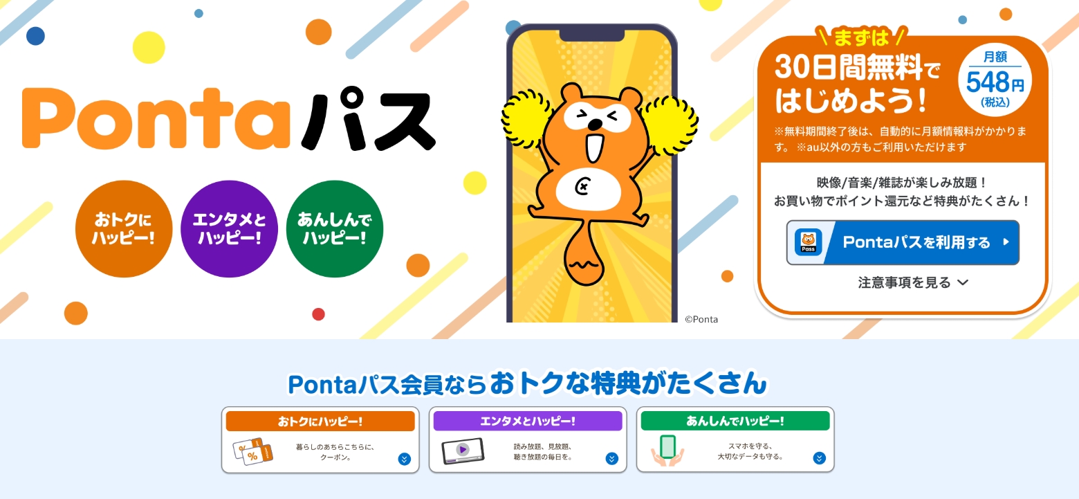 Pontaパスとは、月額548円(税込)という低価格で、買い物・エンタメ・スマホ補償まで網羅できる優秀なサブスクリプションサービスです。