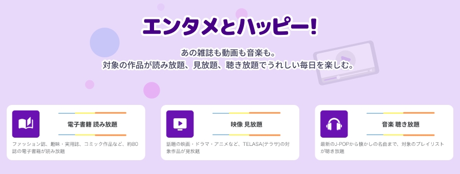 | エンタメとハッピー | 映画・雑誌・音楽が見放題/聴き放題 |